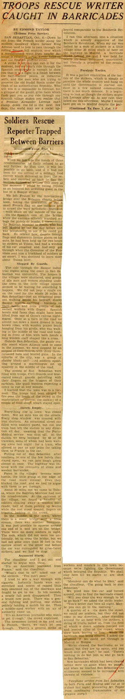 Troops rescue writer caught in barricades.