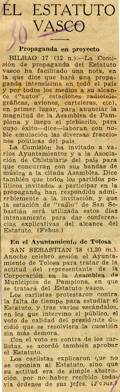 - Nota de la Comisión de propaganda del Estatuto sobre la Asamblea de Pamplona.