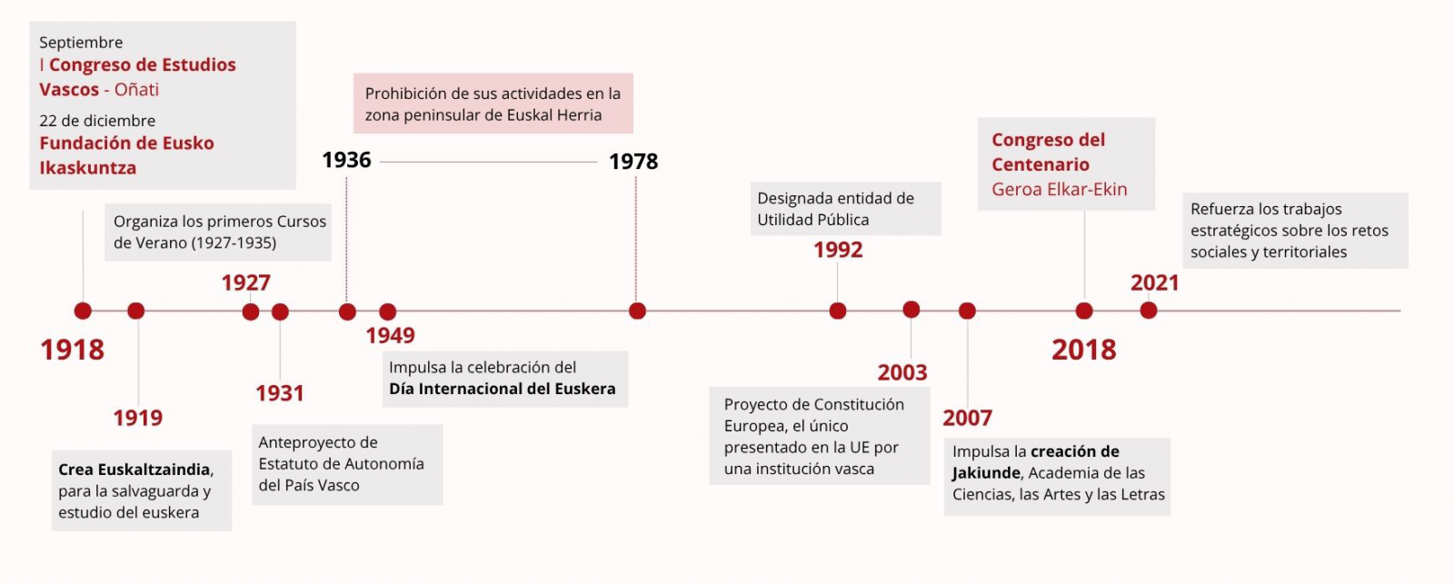 Eusko Ikaskuntza fue fundada por las Diputaciones de Álava-Araba, Bizkaia, Gipuzkoa y Navarra en 1918 y marcó el comienzo de la modernidad cultural vasca.