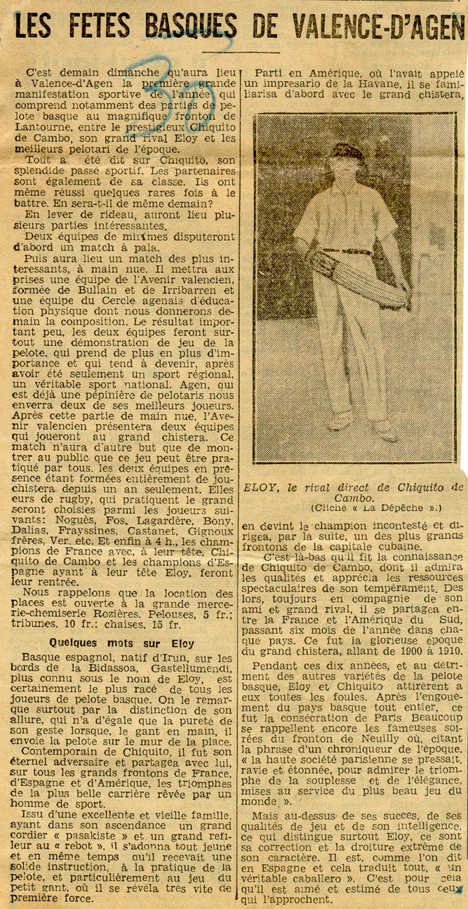 - Programa de pelota. Sobre el pelotari Eloy, cuya foto se incluye.