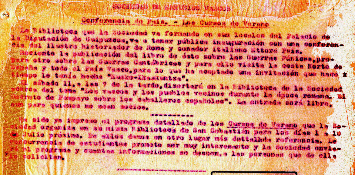 Sociedad de Estudios Vascos. Conferencia de Pais. Los Cursos de Verano.