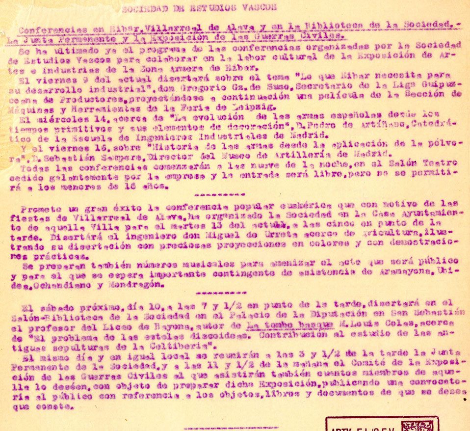 - Sociedad de Estudios Vascos. Conferencias en Eibar, Villareal de Alava y en la Biblioteca de la Sociedad. La Junta Permanente y la Exposición de las Guerras Civiles.