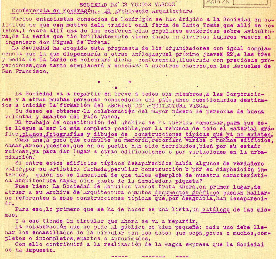 - Repetición en Arrasate de la conferencia de Urreta sobre avicultura. Se anuncia reparto cuestionarios para la historia de la arquitectura vasca.