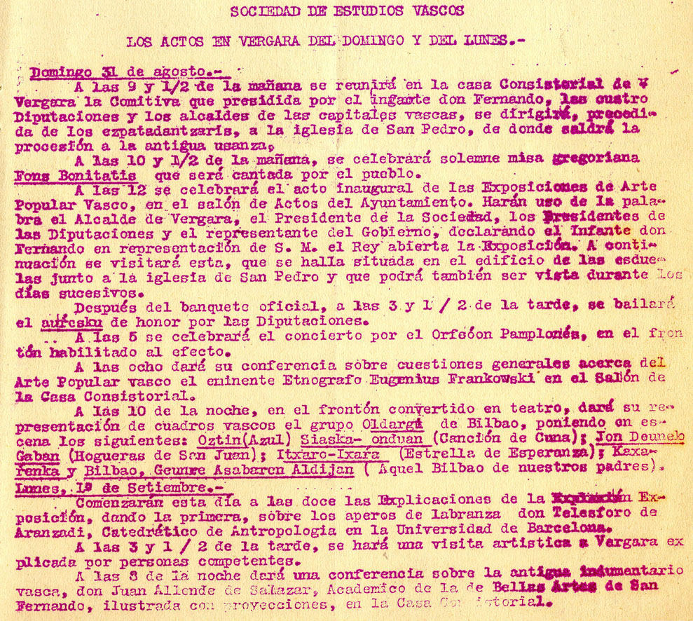 Sociedad de Estudios Vascos. Los actos de Vergara del domingo y el lunes.