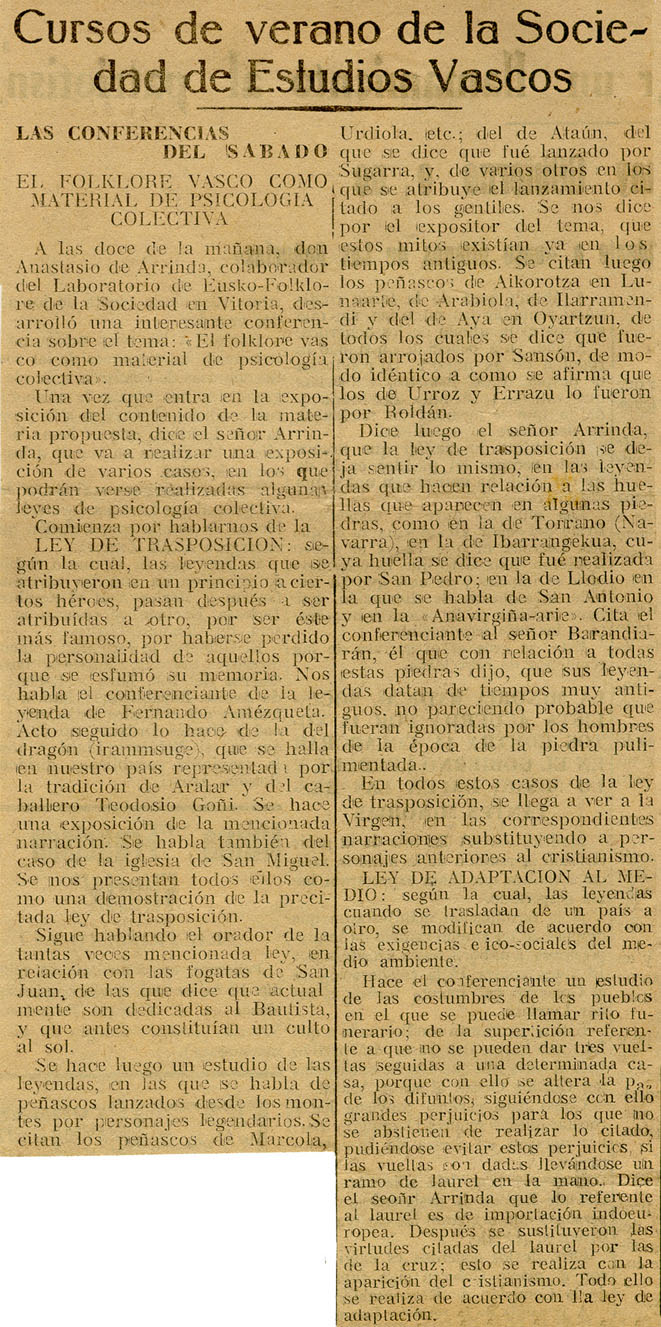 - Reseña de la conferencia de Arrinda sobre "El Folklore vasco como material de psicología colectiva ".
