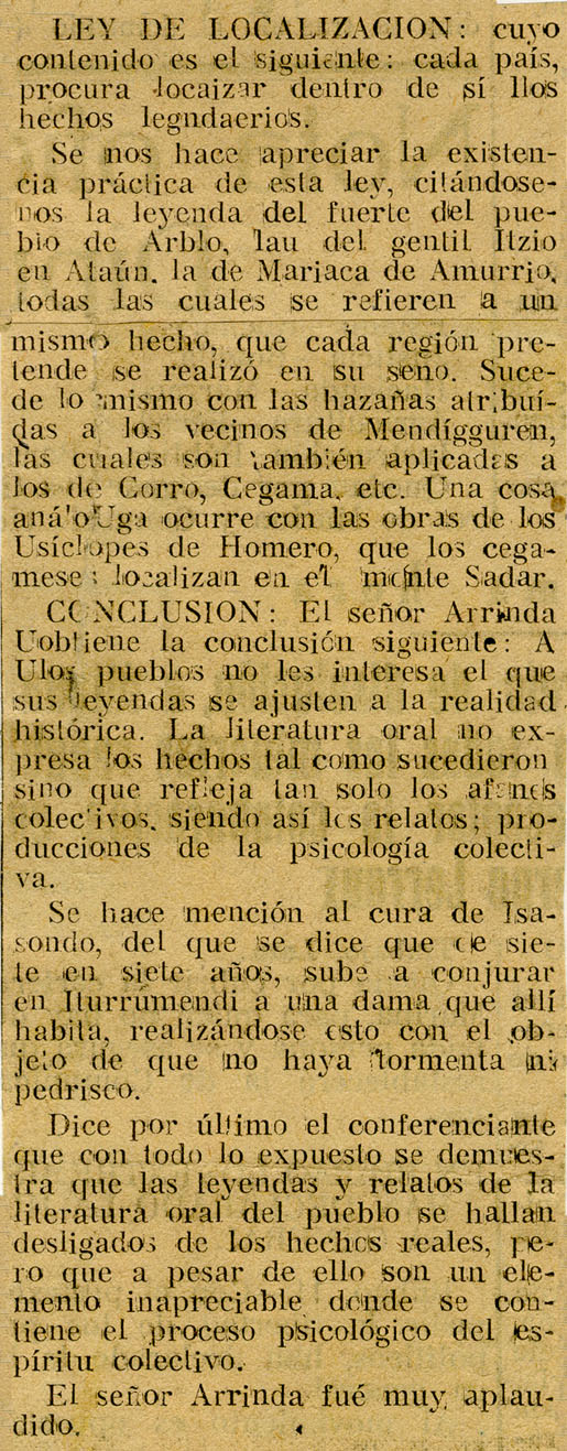 - [Cursos de verano de la Sociedad de Estudios VascosReseña de la conferencia de Arrinda sobre "El Folklore vasco como material de psicología colectiva " [y 2]