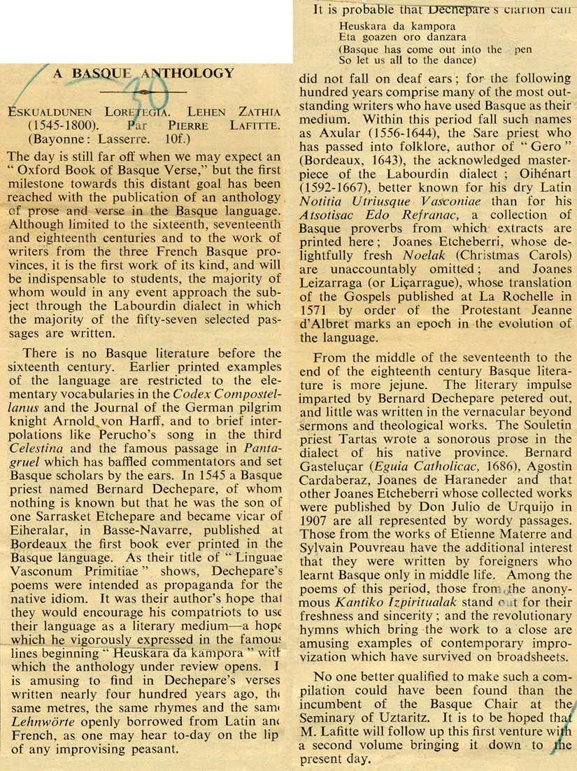 - Reseña de "Eskualdunen Loretegia (1545-1800)", antología poética histórica vasca de Lafitte.