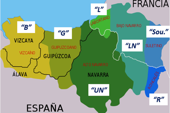Figure 2. Varieties of Basque along with their abbreviations: B = Biscayan; G = Gipuzkoan; L = Lapurdian; UN = Upper Navarrese; LN = Lower Navarrese; Sou. = Souletin; R = Roncalese