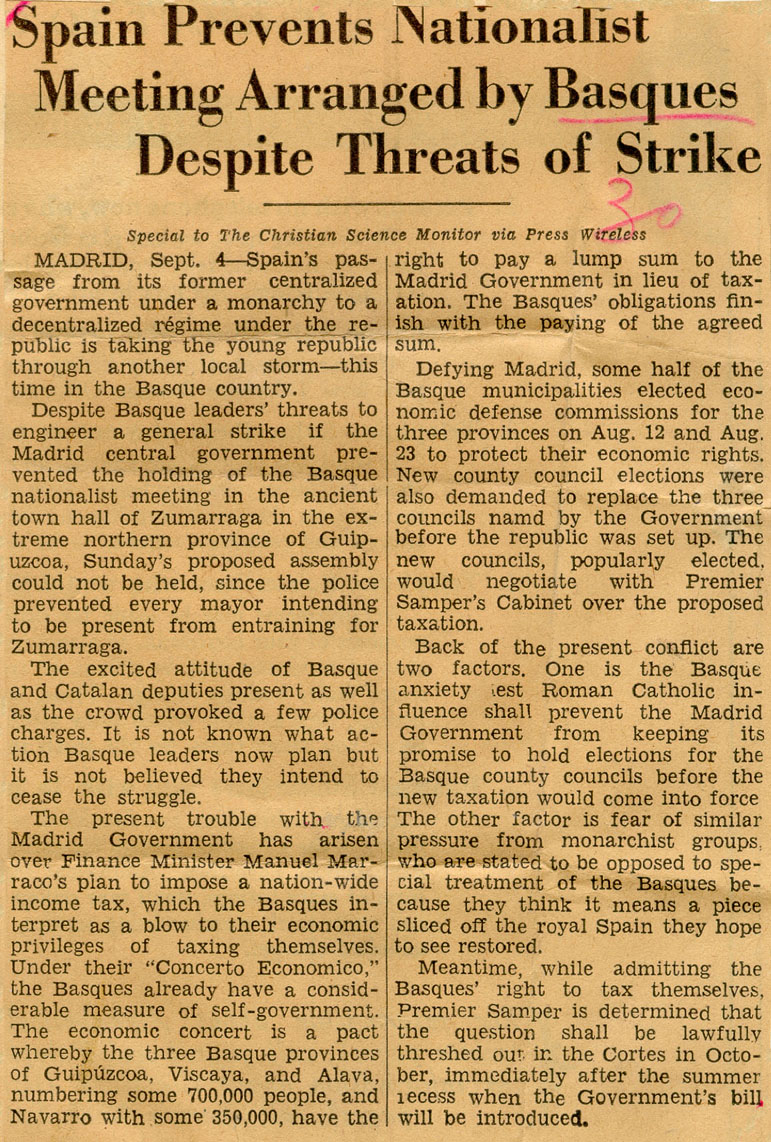 - Spain prevents Nationalist Meeting Arranged by Basques Despite Threats of Strike.