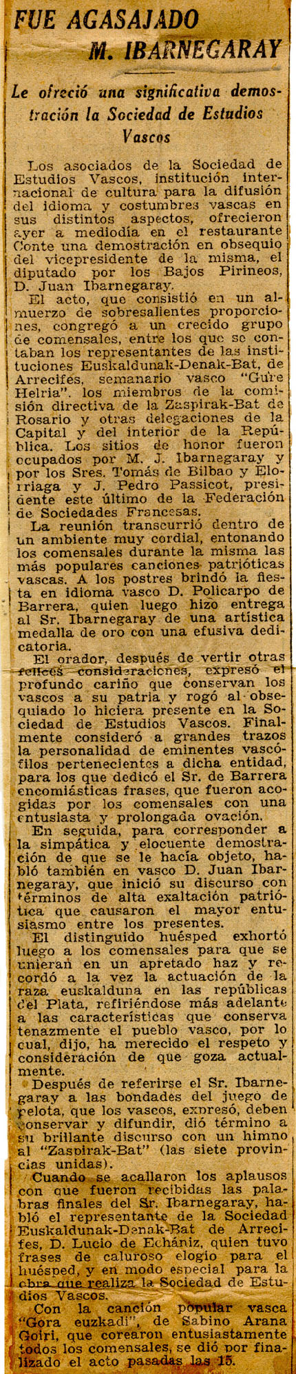 - Fue agasajado M. Ibarnegaray. Le ofreció una significativa demostración la Sociedad de Estudios Vascos.