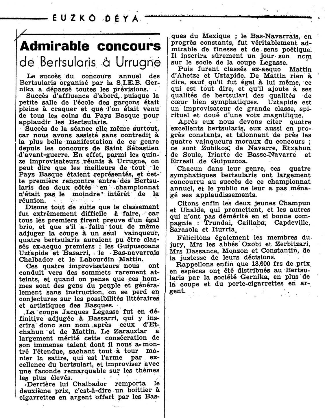 - Artículo que comenta una actuación de bertsolaris en Urruña en la que tomaron parte: Basarri, Uztapide, Xalbador y Mattin.
