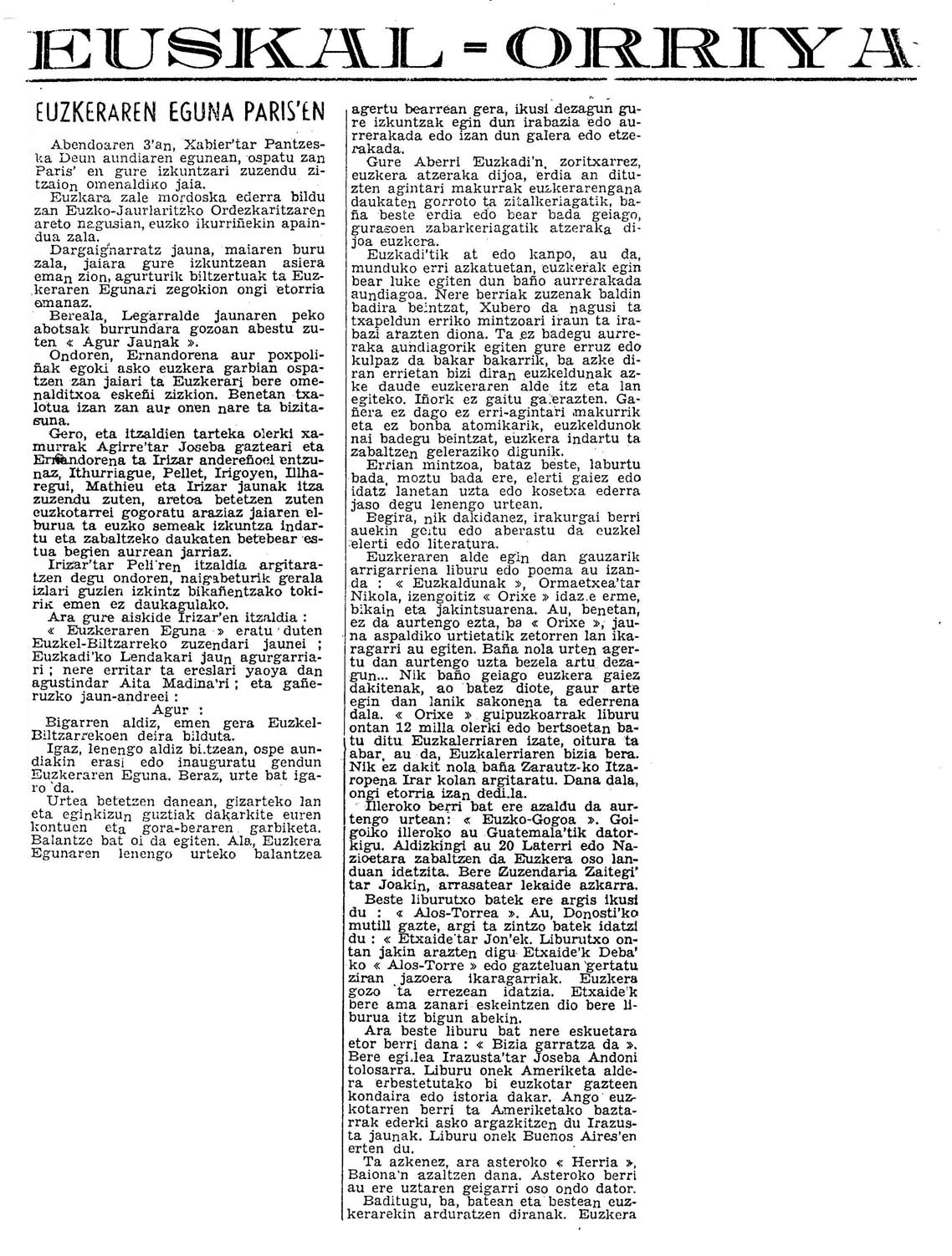 - Artículo que describe la celebración del Día del Euskera, creado por la Sociedad de Estudios Vascos, en Paris.