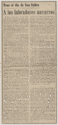 Recorte de prensa procedente de "El Pensamiento Navarro", en el que se recoge un artículo titulado "Tras el día de San Isidro, a los labradores de Navarra".