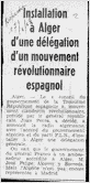 Recorte de prensa extraído de un periódico francés no identificado, en el que se refiere la apertura en Argel de una delegación general del movimiento antifranquista "Tercera República Española", dirigido por el general Juan Perea.