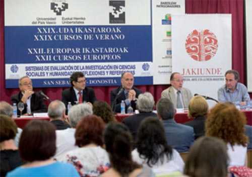 Jakiunde, Academie des Sciences, des Arts et des Lettres, a célébré le 12 juillet une journée dans le cadre des Cours d?Eté de la UPV/EHU sous le titre de "Systèmes d?Evaluation de la Recherche en Sciences Sociales et Humanités: Réflexions et Références". Le cours consista en huit exposés et une table ronde au cours desquels ont été étudiés divers critères, indicateurs d?impact sur les processus d?évaluation des Sciences Sociales et des Humanités.