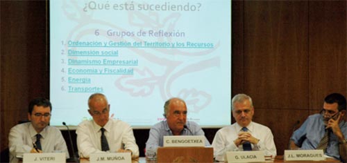 Ainsi naît le processus de révision BAI+5, dont les travaux commencèrent l?été dernier. Six groupes d?analyses ont été constitués en autant de groupes de travail: Economía y fiscalidad, Dinamismo Empresarial, Ordenación del Territorio y los recursos, Energía, Transporte, y Dimensión Social (Economie et fiscalité, Dynamisme d?Entreprise, Aménagement du Territoire et les ressources, Energie, Transport, et Dimension Sociale). Les groupes conformés comme des forums d?échange d?idées, seront axés sur l?identification de nouveaux et meilleurs indicateurs de progrès permettant de s?adapter et d?anticiper, si possible, l?avenir. La première réunion des groupes est prévue pour le 23 septembre.
