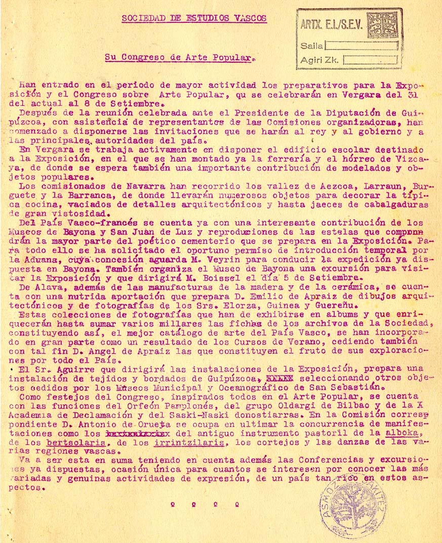 - Sociedad de Estudios Vascos.Su Congreso de Arte Popular.
