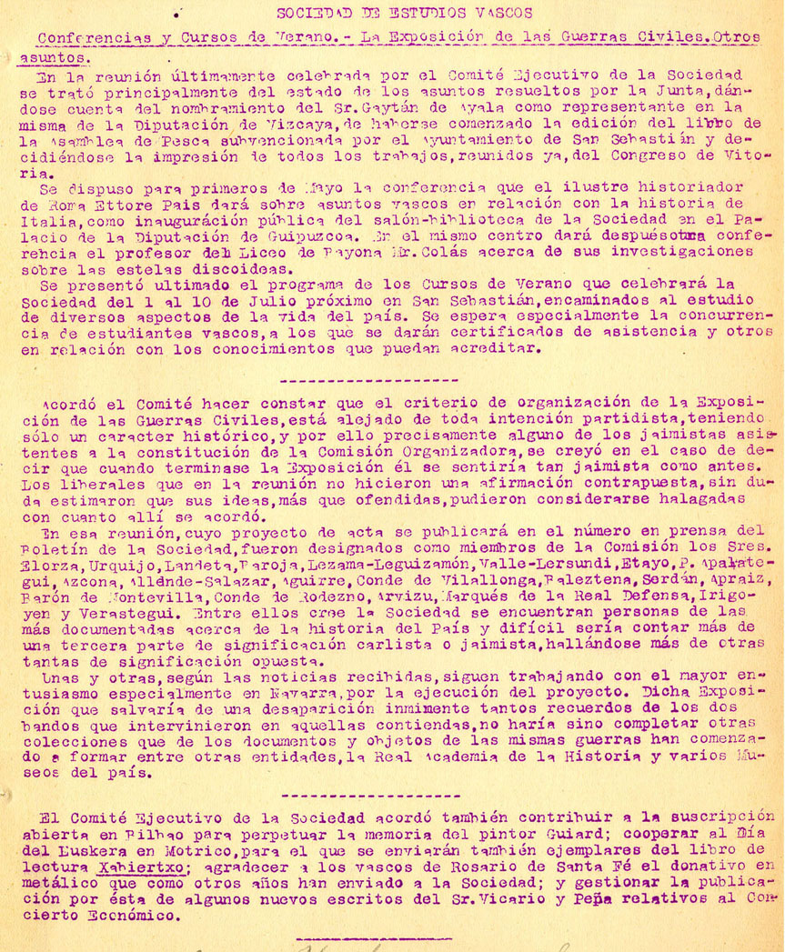 - Sociedad de Estudios Vascos. Conferencias y Cursos de Verano. La Exposición de las Guerras Civiles. Otros asuntos.