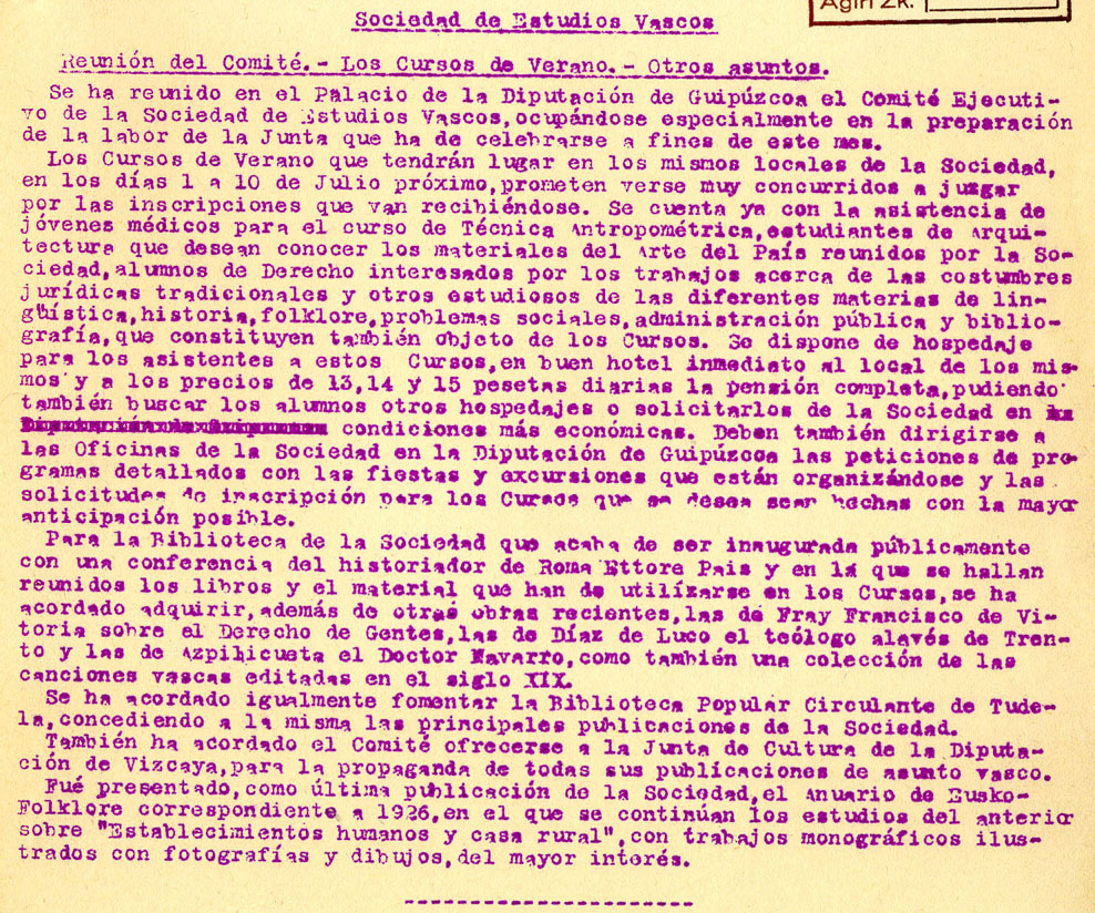 - Sociedad de Estudios Vascos. Reunión del Comité. Los Cursos de Verano. Otros asuntos.