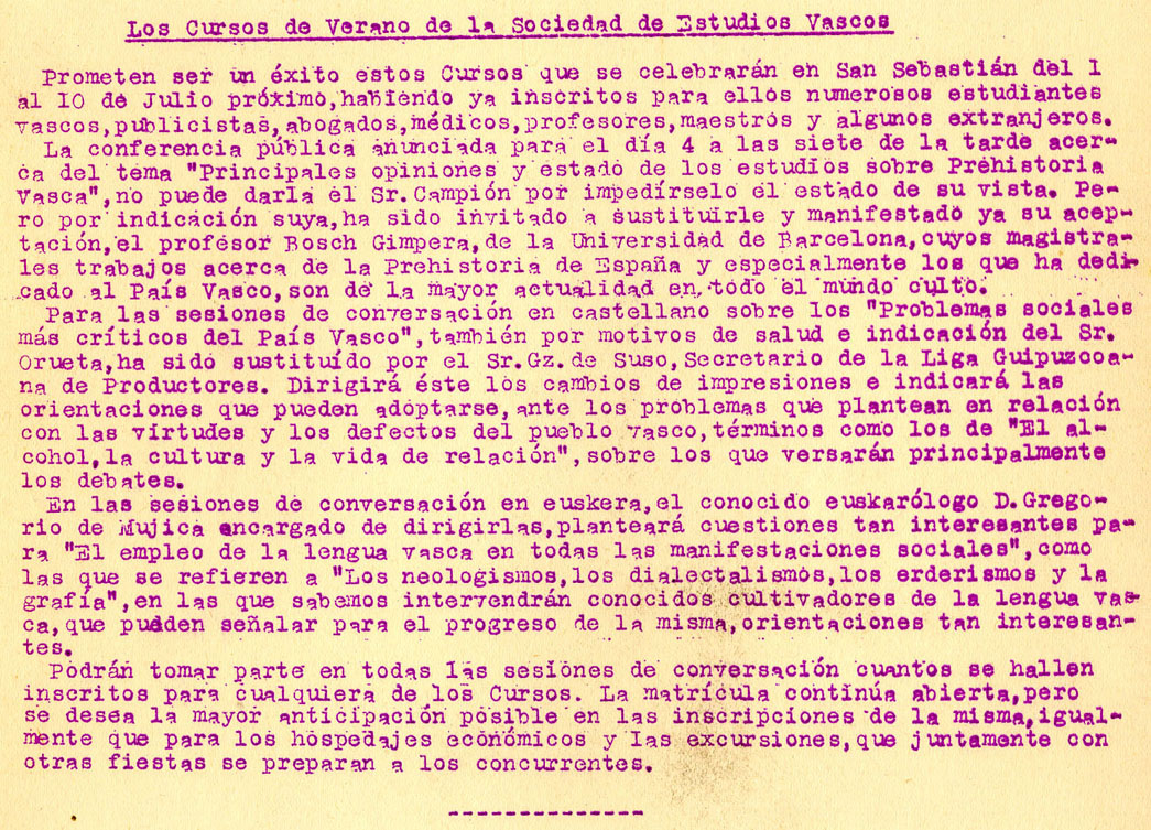 Los Cursos de Verano de la Sociedad de Estudios Vascos.