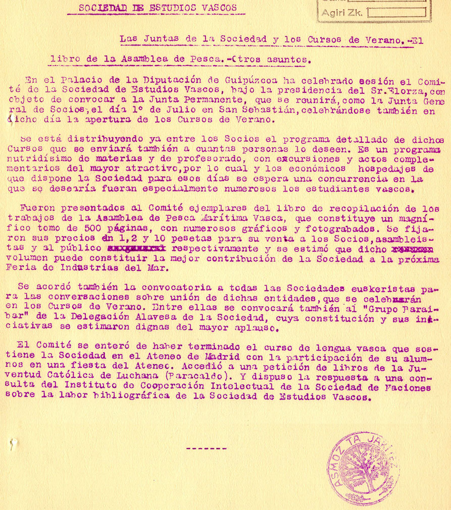 - Sociedad de Estudios Vascos. Las Juntas de la Sociedad y los Cursos de Verano. El Libro de la Asamblea de Pesca. Otros asuntos.