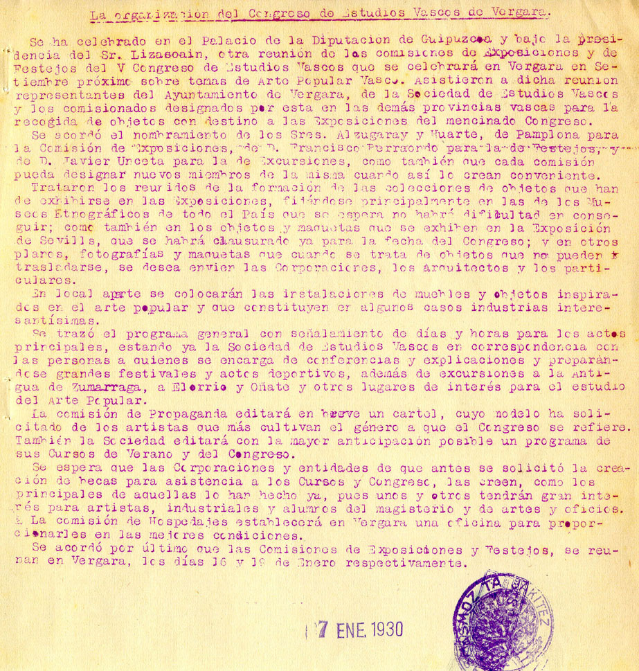 - Dando cuenta de la reunión tenida por las comisiones de Exposiciones y Festejos del Congreso sobre Arte Popular Vasco.