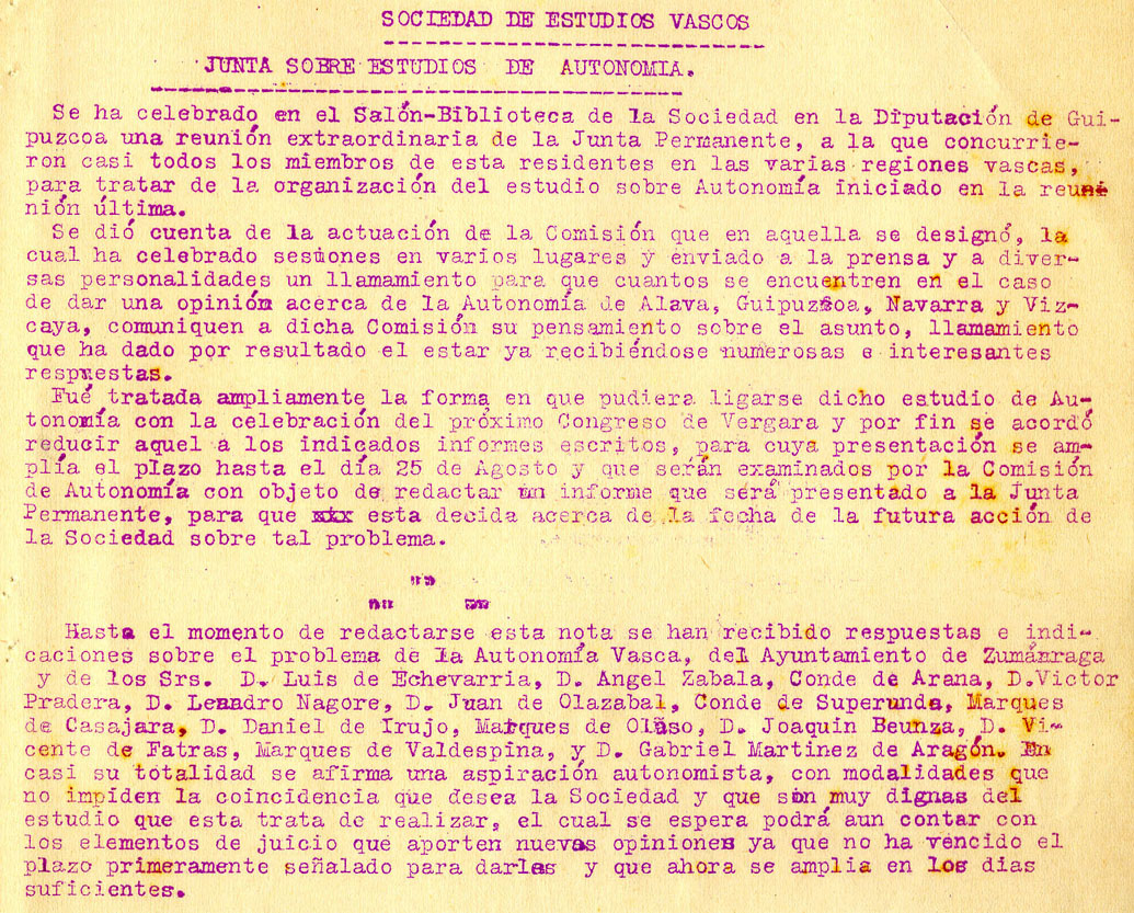 Sociedad de Estudios Vascos. Junta sobre estudios de autonomía.