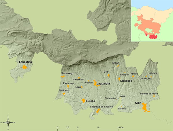 El área de estudio seleccionada es Rioja Alavesa, una de las siete cuadrillas alavesas, localizada al sur de Euskadi y limítrofe con La Rioja en su frontera meridional. Está compuesta por quince municipios: Baños de Ebro, Elciego, Elvillar, Cripán, Labastida, Laguardia, Lanciego, Lapuebla de Labarca, Leza, Moreda de Álava, Navaridas, Oyón/Oion, Samaniego, Villabuena de Álava y Yécora. Estos municipios, además de formar la cuadrilla, constituyen el Área Funcional homónima para la Ordenación Territorial de Euskadi y, en total, comprenden 25 núcleos de población (Figura 1).