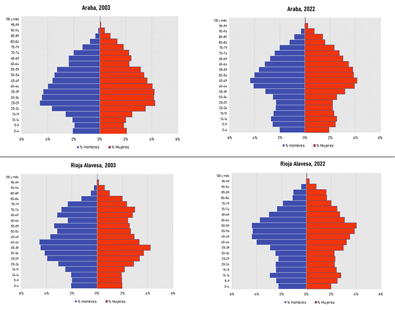 Figura 2. Pirámides de población de Rioja Alavesa y Álava