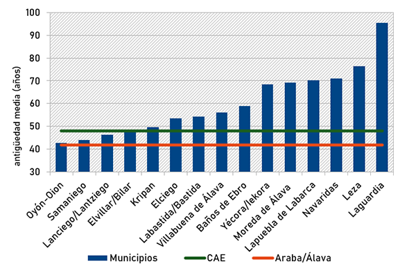 Otra característica destacable es la antigüedad del parque de viviendas (Figura 4), con una de las medias más altas de todo Euskadi. Como se puede observar, todos los municipios se encuentran por encima de la media alavesa, siendo Oyón/Oion el único que se aproxima a ella, aunque aún por encima. Destaca Laguardia, al ser el municipio con la antigüedad media más alta de toda la comunidad autónoma, casi 100 años.