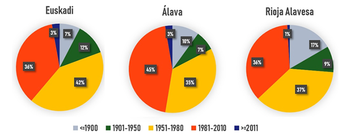 Figura 5. Proporción de viviendas construidas en distintos periodos de tiempo en Euskadi, Araba y Rioja Alavesa
