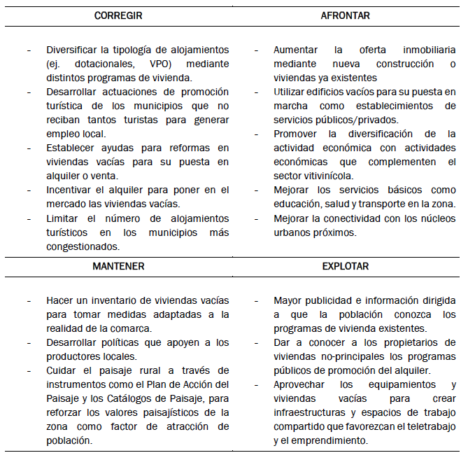 El diagnóstico es aproximativo y podría enriquecerse mediante una explotación de la información cartográfica y de la información catastral, analizando con mayor nivel de detalle la distribución y condiciones de las viviendas. El análisis también se podría completar con un diagnóstico a escala de entidad local menor para conocer con mayor exactitud la realidad dentro de la comarca. Por último, la realización de trabajo de campo in situ habría aportado un inventario más preciso de las viviendas vacías y en mal estado.