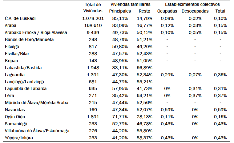 Al examinar los tipos de viviendas en la comarca (Tabla 1), destaca la alta proporción de viviendas no principales, es decir, aquellas que no se utilizan como residencial habitual la mayor parte del año, incluyendo tanto viviendas secundarias como vacías. En la comarca, la mitad del cómputo total de viviendas pertenecen a este grupo, una proporción más de tres veces superior a la media vasca y alavesa (14,79 % y 16,77 %, respectivamente). Únicamente el municipio de Oyón/Oion presenta una situación algo más favorable (28,13 %), aunque sigue estando lejos de los valores que presenta el conjunto de Euskadi. En cambio, en Leza y Labastida solo un tercio son viviendas principales.