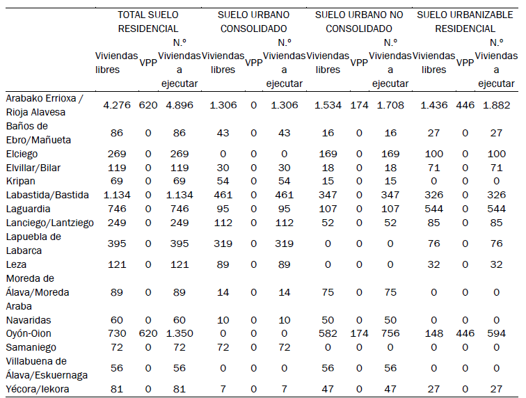 Dentro de las viviendas a ejecutar (Tabla 2), es importante distinguir entre vivienda libre y Vivienda de Protección Pública (VPP). Predominan las viviendas libres, y sólo Oyón/Oion, que es el único municipio de la provincia que se encuentra obligado por ley al superar los 3.000 habitantes, tiene previsto construir VPP.