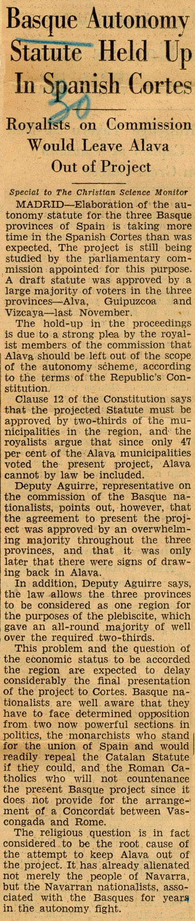 - Basque Autonomy Statute Held Up In Spanish Cortes.