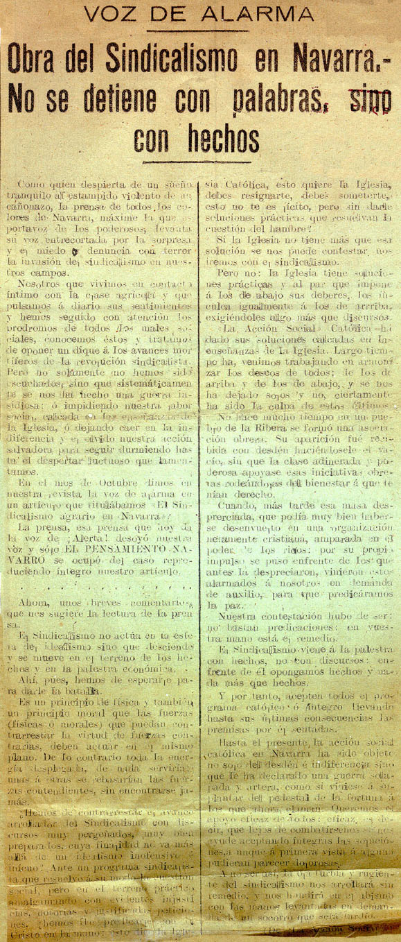 Voz de alarma. Obra del Sindicalismo en Navarra. No se detiene con palabras, sino con hechos.