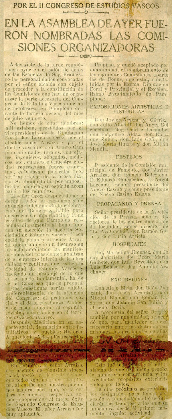 Por el II Congreso de Estudios Vascos. En la Asamblea de ayer fueron nombradas las comisiones organizadoras.