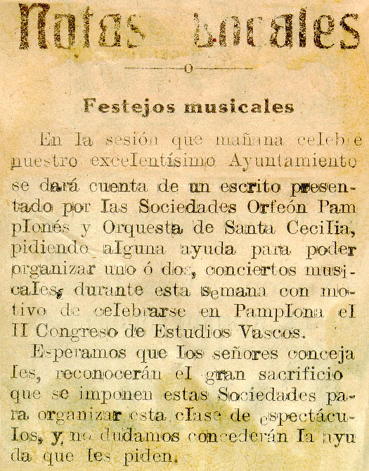 - La orquesta y el orfeón van a solicitar del ayuntamiento ayuda para celebrar algún concierto esta semana coincidiendo con el Congreso.