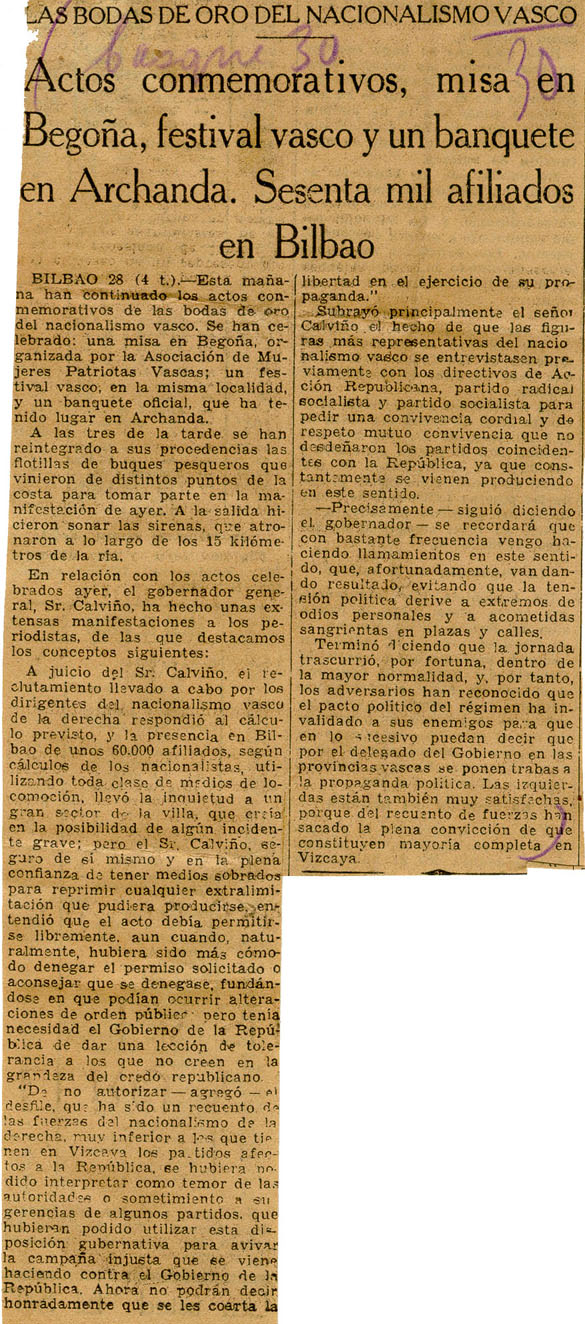 - Las bodas de oro del nacionalismo vasco. Actos conmemorativos, misa en Begoña, festival vasco y un banquete en Archanda. Sesenta mil afiliados en Bilbao.
