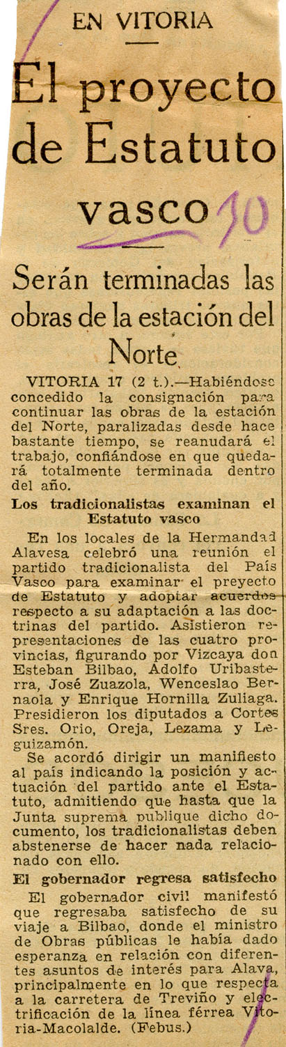 En Vitoria. El proyecto de Estatuto Vasco.