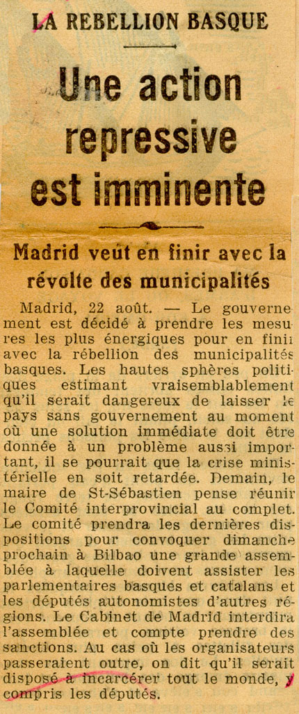La rebellion basque. Une action repressive est inminente.