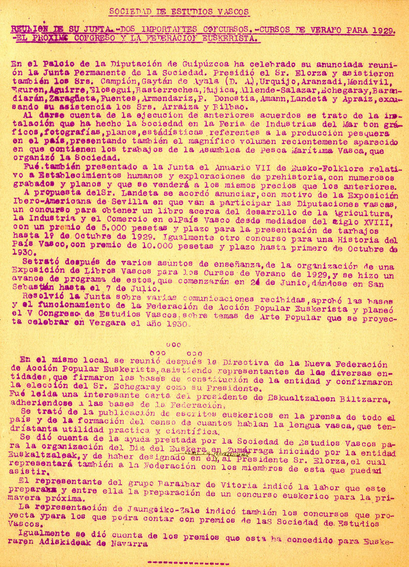 - Sociedad de Estudios Vascos. Reunión de su Junta. Dos importantes concursos. Cursos de Verano para 1929. El próximo Congreso y la Federación Euskerista.