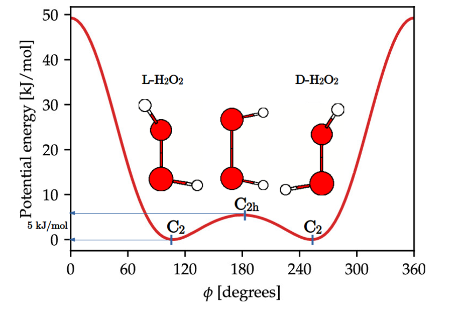 | Appendix 1 Let us digress a moment and talk about what symmetry breaking means. Consider hydrogen peroxide, H2O2. The molecule is not planar, the H-O-O-H backbone is known to make a dihedral angle ϕ=111.5 degrees and consequently yields a C2 point group molecular structure, which lacks a center of inversion. The planar structure C2h like structure is a transition state separating the L and D enantiomers by an energy barrier of ~5 kJ/mol, as shown in Figure A1. Namely, at this transition state the inversion symmetry is broken and the molecular spontaneously chooses one of the two L or D symmetry-broken states. Let us digress a moment and talk about what symmetry breaking means. Consider hydrogen peroxide, H2O2. The molecule is not planar, the H-O-O-H backbone is known to make a dihedral angle ϕ=111.5 degrees and consequently yields a C2 point group molecular structure, which lacks a center of inversion. The planar structure C2h like structure is a transition state separating the L and D enantiomers by an energy barrier of ~5 kJ/mol, as shown in Figure A1. Namely, at this transition state the inversion symmetry is broken and the molecular spontaneously chooses one of the two L or D symmetry-broken states.