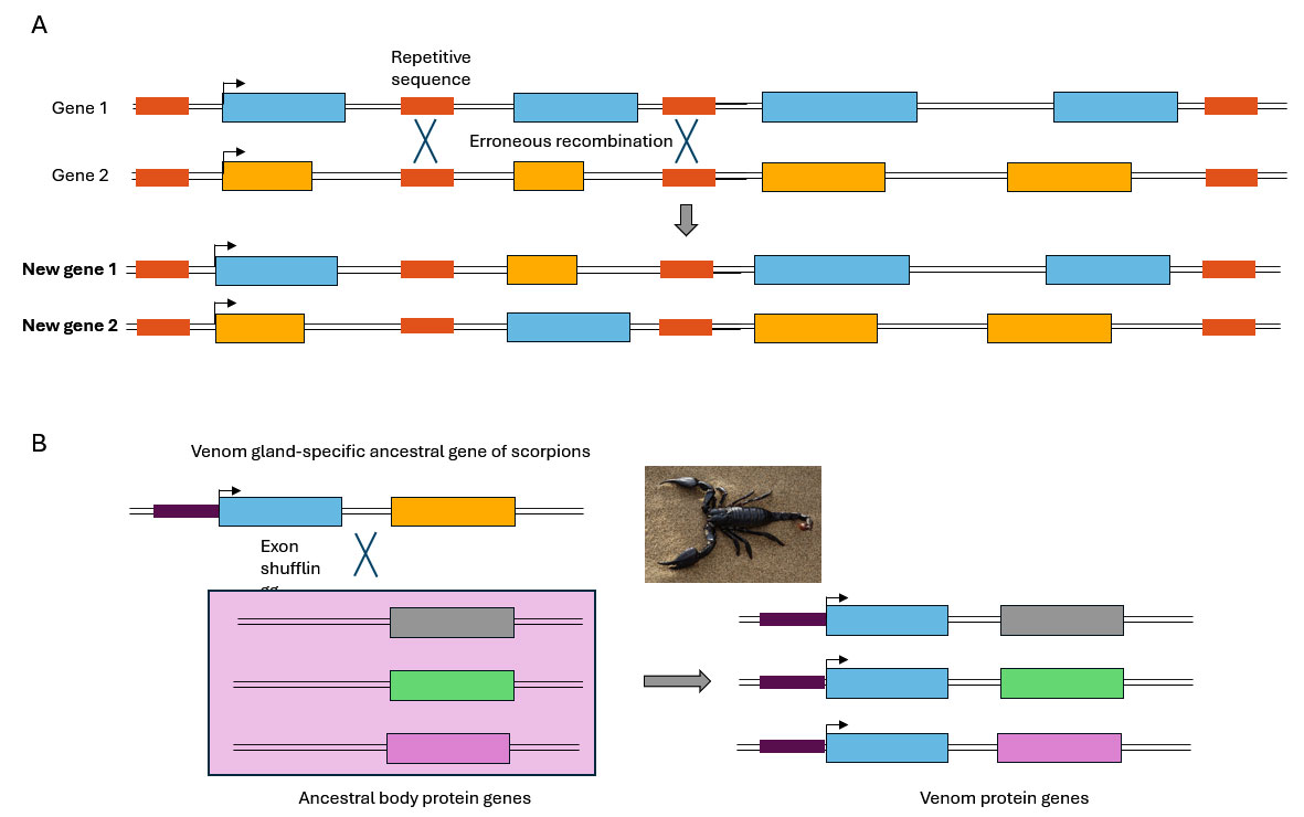 An intriguing example of exon shuffling can be found in the evolutionary origin of scorpion venom toxins. It has been proposed that an ancestral gene expressed specifically in the venom gland, acted as a donor by providing two necessary regulatory elements for venom gland‐specific expression: a promoter and a secretory signal. A diversity of genes encoding body proteins would have served as sources of coding exons that contributed the sequence diversity of the toxins (Wang et al., 2016). These exon shuffling events are thought to have occurred multiple times throughout evolution in scorpion lineage, giving rise to an array of venom proteins with distinct specificities (Figure 2B).