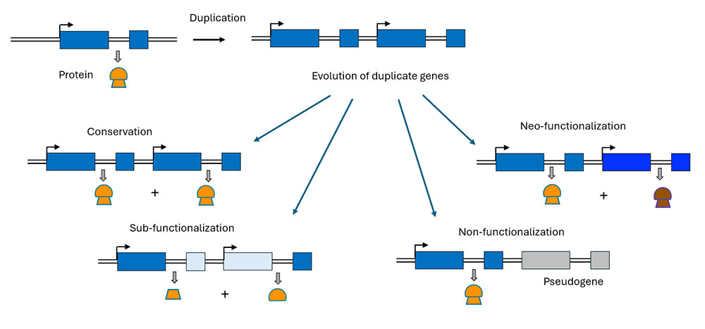 Collectively, these different evolutionary outcomes illustrate how gene duplication can drive functional innovation and contribute to biological diversity. While non-functionalization may lead to gene loss in some cases, the retention and divergence of duplicates through conservation, neo-functionalization, or sub-functionalization generates new gene functions, modifies gene regulatory networks, and allows for the specialization of molecular pathways. In this way, the fate of duplicated genes is not simply a matter of molecular redundancy, but a fundamental process through which genomes acquire novel functional capabilities, ultimately shaping the complexity and adaptability of living organisms.