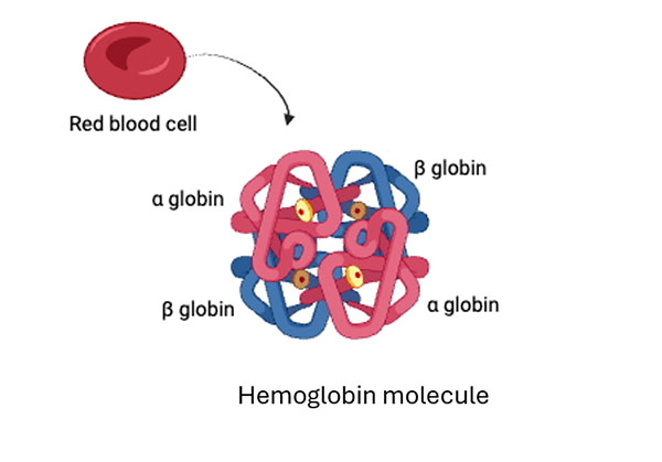 It is a heterotetramer composed of two α‑globin chains and two β‑globin chains (α₂β₂). Created in https://BioRender.com
