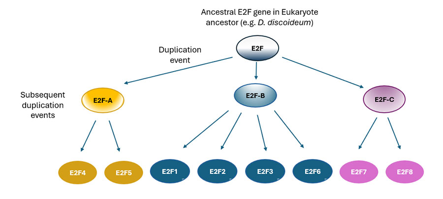 Together, the evolution of the E2F gene family illustrates how gene duplication, followed by functional divergence, can drive the emergence of regulatory complexity. The preservation of ancestral functions among E2F4/5 and the acquisition of new, activating or repressive roles by E2F1, 2, 3 and 6 and E2F7/8 reflect the evolutionary flexibility of transcription factor networks. This diversification likely enabled a more fine-tuned control over cell proliferation, differentiation, and development, critical processes in the transition to multicellular life. By expanding and specializing, the E2F family exemplifies how transcriptional regulators evolve in concert with increasing organismal complexity.