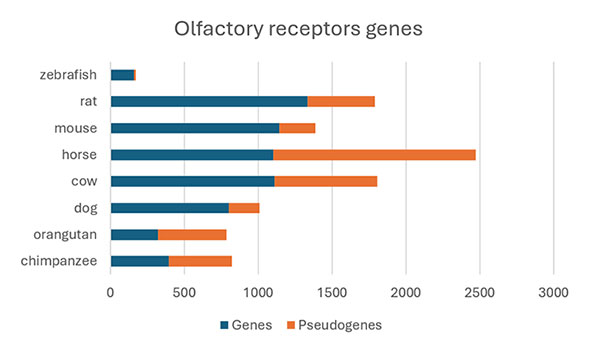 Figure 10. Number of olfactory receptor genes in various vertebrate genomes