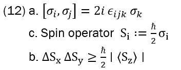 Defining spin operators as in (12b) implies uncertainty relations for spin components (12c). That has little to do with Heisenberg’s initial use of uncertainty: it arises from operator structure in a finite-dimensional Hilbert space. Pauli’s insight was that, rather than about measurement disturbance in FT conditions, uncertainty is a structural consequence of non-abelian symmetry.