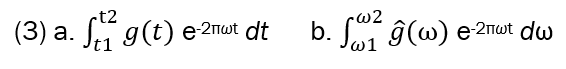 over frequency, whose output is a complex number corresponding to the strength of the frequency in the signal. We can, thus, also express (3a) inversely as in (3b), to integrate over ω instead of t, thus converting a signal in the frequency domain ω to one in the time domain t: